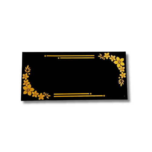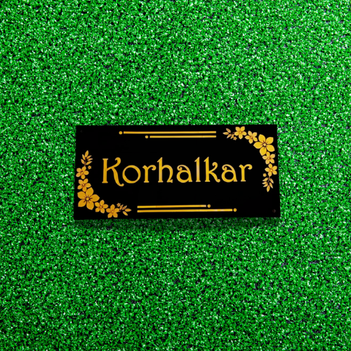 A bold black acrylic nameplate with elegant gold floral detailing and stylish typography. Perfect for modern homes that want a classy and luxurious entrance look.