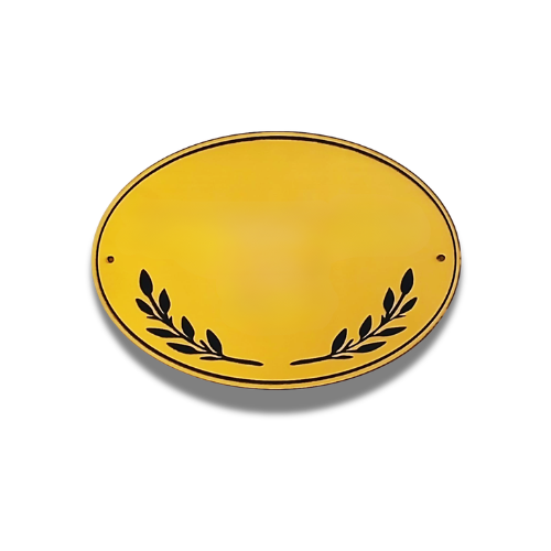 A timeless oval gold nameplate with elegant black lettering and decorative leaf detailing. Perfect for doctors, professionals, and homes seeking a refined entrance look.