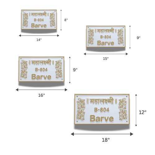 A luxurious white and gold acrylic nameplate featuring “Mahalakshmi” text and elegant floral side detailing. Perfect for homes seeking a divine and royal entrance look.