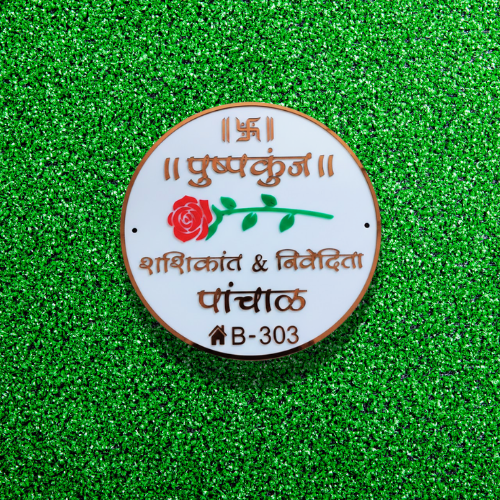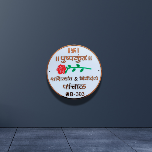 A beautiful round Marathi nameplate featuring a rose design and traditional symbols. Perfect for homes that want a graceful and culturally inspired entrance look.