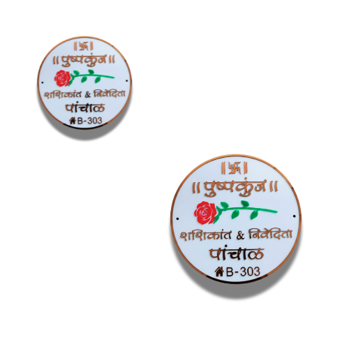 Welcome elegance and tradition into your home with our Pushpakunj Round Marathi Floral Nameplate. Designed in a clean circular shape with a soft white base, this nameplate beautifully blends cultural elements with modern craftsmanship.