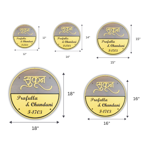 Bring elegance and serenity to your entrance with our Sukoon Dual-Tone Round Designer Nameplate. Designed with a sophisticated grey upper panel and a rich gold lower base, this nameplate reflects modern luxury with subtle charm.