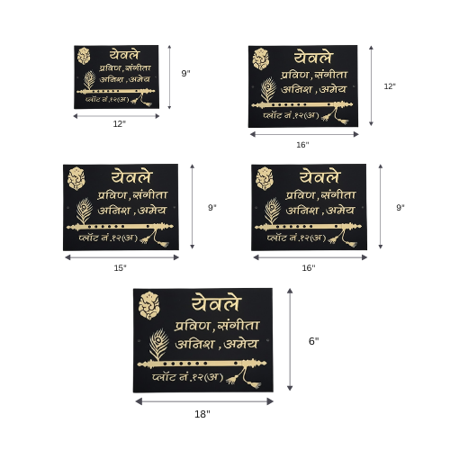 A luxurious black and gold Marathi nameplate featuring Ganpati, peacock feather, and flute detailing. Perfect for families who want a royal and culturally rich entrance design.