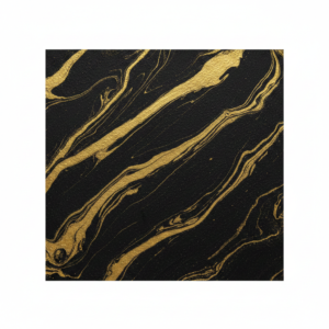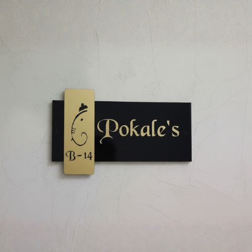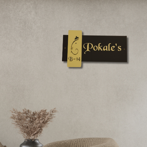 A stylish modern acrylic nameplate featuring a sleek black base with elegant gold lettering and a minimalist Lord Ganesha motif. The layered design adds depth and sophistication, making it a perfect choice for contemporary homes and apartments.