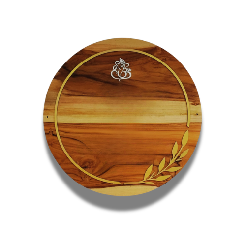 A premium round wooden nameplate with elegant gold ring detailing and subtle Ganpati artwork. Perfect for modern homes seeking a warm yet luxurious entrance look.