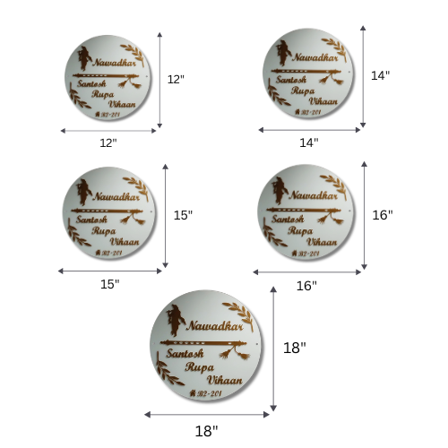 A beautifully designed round acrylic nameplate featuring elegant copper lettering and artistic Krishna flute elements. The clean white background combined with decorative leaf patterns and a Krishna silhouette creates a graceful and spiritual entrance display for your home.