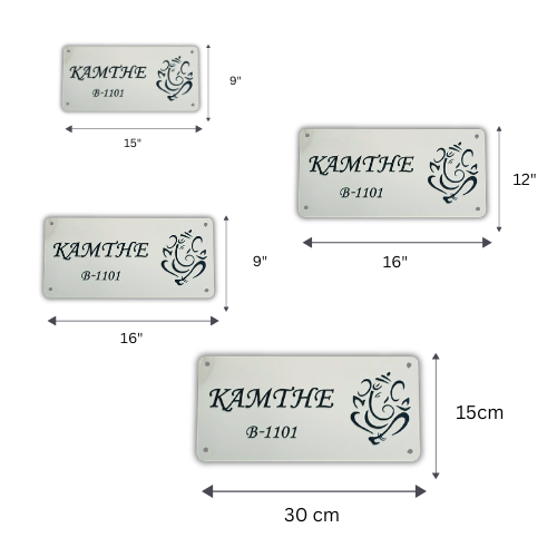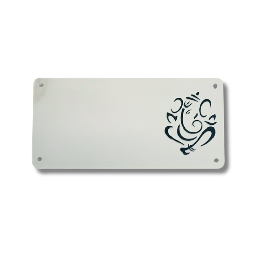 A sleek white frosted acrylic nameplate featuring stylish typography and a modern Ganpati design. Perfect for homes that prefer a clean, classy, and spiritual entrance look.
